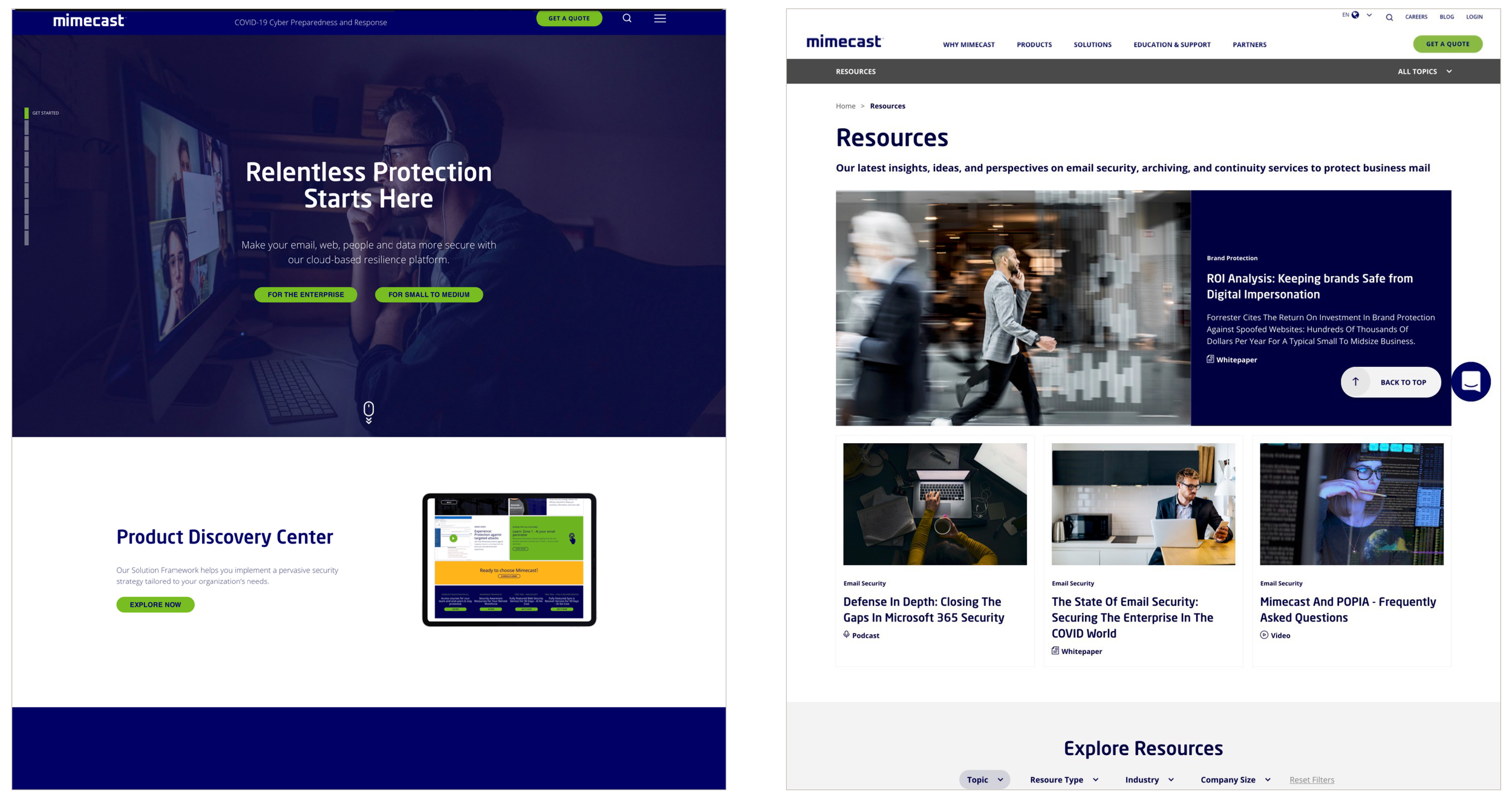 Before & After: before (left) and after (right). The new Resources section helped position Mimecast as an authority on web security, placing emphasis on their knowledge and expertise.